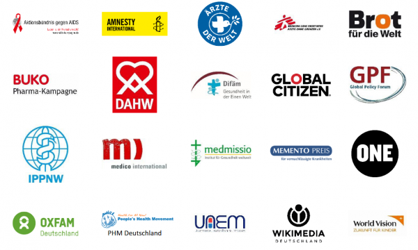 Aktionsbündnis gegen AIDS, Amnesty International, Ärzte der Welt, Ärzte ohne Grenzen e.V. / Médecins Sans Frontières, Brot für die Welt, BUKO Pharma-Kampagen, DAHW Deutsche Lepra- und Tuberkulosehilfe e.V., Deutsches Institut für Ärztliche Mission e.V., Global Citizen, Global Policy Forum, PPNW e.V., medico international, medmissio - Institut für Gesundheit weltweit, Memento Bündnis, ONE, Oxfam Deutschland, People’s Health Movement, Universities Allied for Essential Medicines, Wikimedia, World Vision Deutschland e.V.