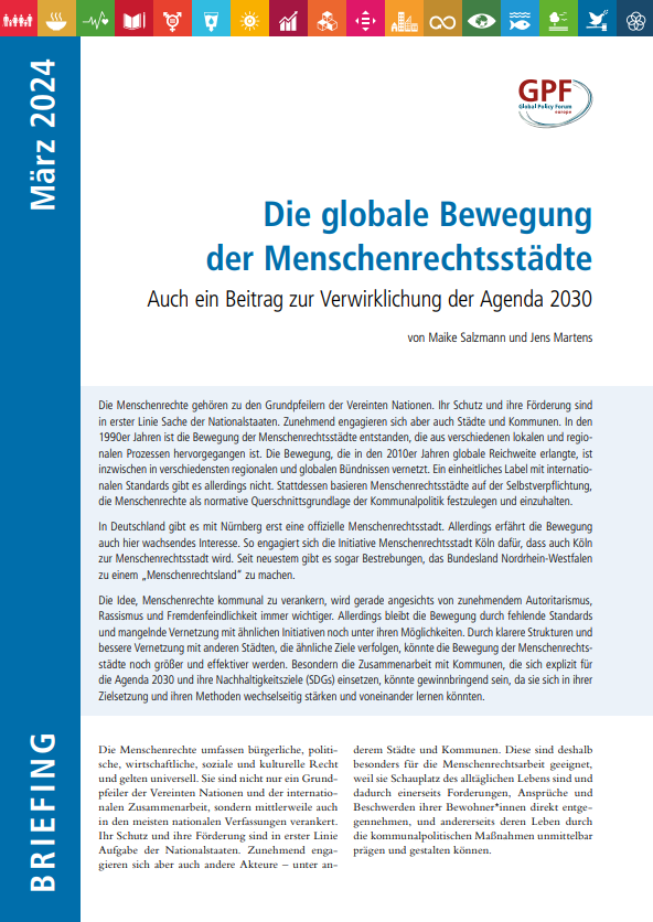 Die Idee, Menschenrechte kommunal zu verankern, wird gerade angesichts von zunehmendem Autoritarismus, Rassismus und Fremdenfeindlichkeit immer wichtiger. Allerdings bleibt die Bewegung durch fehlende Standards und mangelnde Vernetzung mit ähnlichen Initiativen noch unter ihren Möglichkeiten. Durch klarere Strukturen und bessere Vernetzung mit anderen Städten, die ähnliche Ziele verfolgen, könnte die Bewegung der Menschenrechtsstädte noch größer und effektiver werden. Besondern die Zusammenarbeit mit Kommunen, die sich explizit für die Agenda 2030 und ihre Nachhaltigkeitsziele (SDGs) einsetzen, könnte gewinnbringend sein, da sie sich in ihrer Zielsetzung und ihren Methoden wechselseitig stärken und voneinander lernen können.