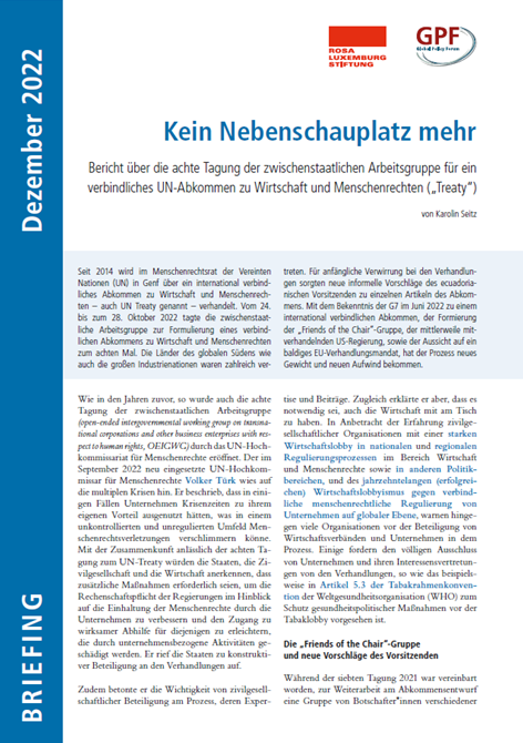 Seit 2014 wird im Menschenrechtsrat der Vereinten Nationen (UN) in Genf über ein international verbindliches Abkommen zu Wirtschaft und Menschenrechten – auch UN Treaty genannt – verhandelt. Vom 24. bis zum 28. Oktober 2022 tagte die zwischenstaatliche Arbeitsgruppe zur Formulierung eines verbindlichen Abkommens zu Wirtschaft und Menschenrechten zum achten Mal. Die Länder des globalen Südens wie auch die großen Industrienationen waren zahlreich vertreten. Für anfängliche Verwirrung bei den Verhandlungen sorgten neue informelle Vorschläge des ecuadorianischen Vorsitzenden zu einzelnen Artikeln des Abkommens. Mit dem Bekenntnis der G7 im Juni 2022 zu einem international verbindlichen Abkommen, der Formierung der „Friends of the Chair“-Gruppe, der mittlerweile mitverhandelnden US-Regierung, sowie der Aussicht auf ein baldiges EU-Verhandlungsmandat, hat der Prozess neues Gewicht und neuen Aufwind bekommen.