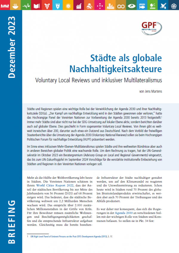 Im Sinne eines inklusiven Mehr-Ebenen-Multilateralismus spielen Städte und ihre weltweiten Bündnisse aber auch in anderen Bereichen globaler Politik eine wachsende Rolle. Um dem Rechnung zu tragen, hat der UN-Generalsekretär im Oktober 2023 ein Beratergremium (Advisory Group on Local and Regional Governments) eingesetzt, das bis zum UN-Zukunftsgipfel im September 2024 Vorschläge für die verstärkte institutionelle Einbeziehung von Städten und Regionen in den Vereinten Nationen vorlegen soll.