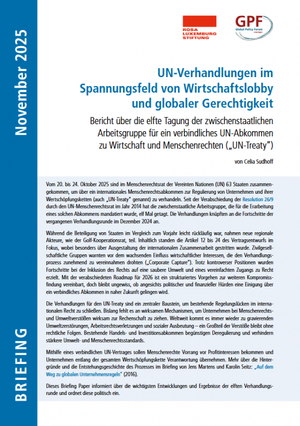 Die Verhandlungen knüpften an die Fortschritte der vergangenen Verhandlungsrunde im Dezember 2024 an und sind ein zentraler Baustein, um bestehende Regelungslücken im internationalen Recht zu schließen. Bislang fehlt es an wirksamen Mechanismen, um Unternehmen bei Menschenrechts- und Umweltverstößen wirksam zur Rechenschaft zu ziehen. Weltweit kommt es immer wieder zu gravierenden Umweltzerstörungen, Arbeitsrechtsverletzungen und sozialer Ausbeutung – ein Großteil der Verstöße bleibt ohne rechtliche Folgen. Bestehende Handels- und Investitionsabkommen begünstigen Deregulierung und verhindern stärkere Umwelt- und Menschenrechtsstandards.