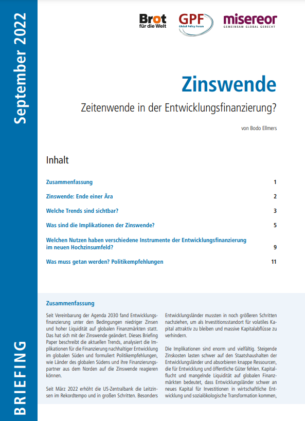 Seit Vereinbarung der Agenda 2030 fand Entwicklungsfinanzierung unter den Bedingungen niedriger Zinsen und hoher Liquidität auf globalen Finanzmärkten statt. Das hat sich mit der Zinswende geändert. Dieses Briefing Paper beschreibt die aktuellen Trends, analysiert die Implikationen für die Finanzierung nachhaltiger Entwicklung im globalen Süden, und formuliert Politikempfehlungen wie Länder des globalen Südens und ihre Finanzierungspartner aus dem Norden auf die Zinswende reagieren können.