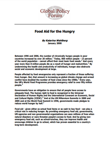 This Global Policy Forum report critically reviews the global food aid system. Author Katarina Wahlberg argues that food aid donors fall short in prioritizing the needs of the poor and hungry. Instead, donor countries use food aid to promote their own national strategic and commercial interests. Such food aid not only fails to reduce hunger, it can also harm long-term food security in recipient countries.